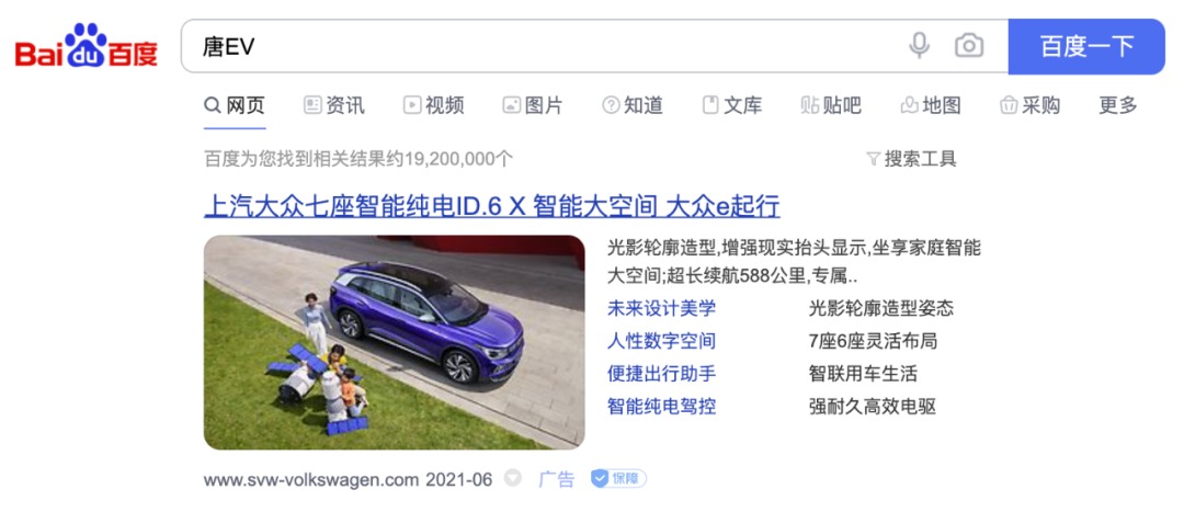 这其实不难理解,因为大众的ID.6 X或者说整个ID纯电家族,就是瞄准着正在崛起的自主品牌而来的。甚至当你在臭名昭著的百度搜索输入“唐EV”时,弹出来的第一个结果正是ID.6 X......