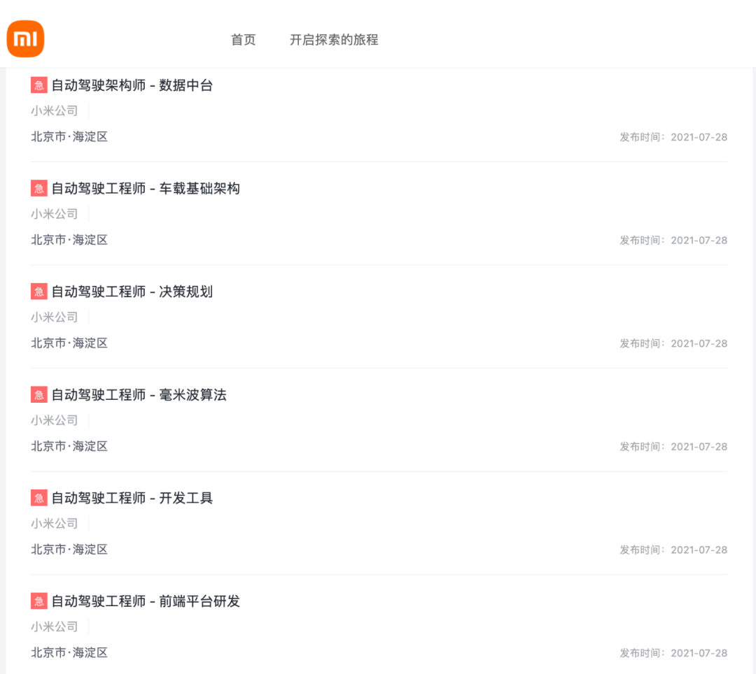 而在7月28日,在小米的官方招聘页面上,更是出现了大量自动驾驶方面的招聘信息,从决策规划到算法等不同岗位,涵盖汽车自动驾驶的各个领域。就连老板雷军,也亲自发微博招募500名自动驾驶方面的技术精英,可见小米对于这项面向未来的技术有多么看重。