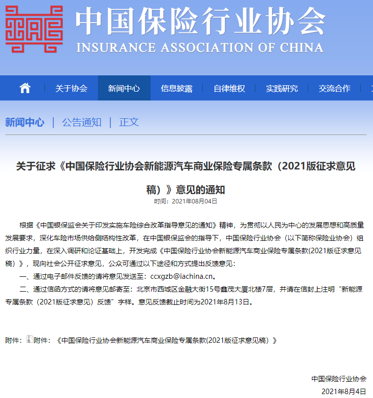 在近日,中国保险行业协会公布了一份名为关于征求《中国保险行业协会新能源汽车商业保险专属条款(2021版征求意见稿)》意见的通知,这也意味着,国内市场也许将很快迎来为新能源车“量身打造”的保险条款。