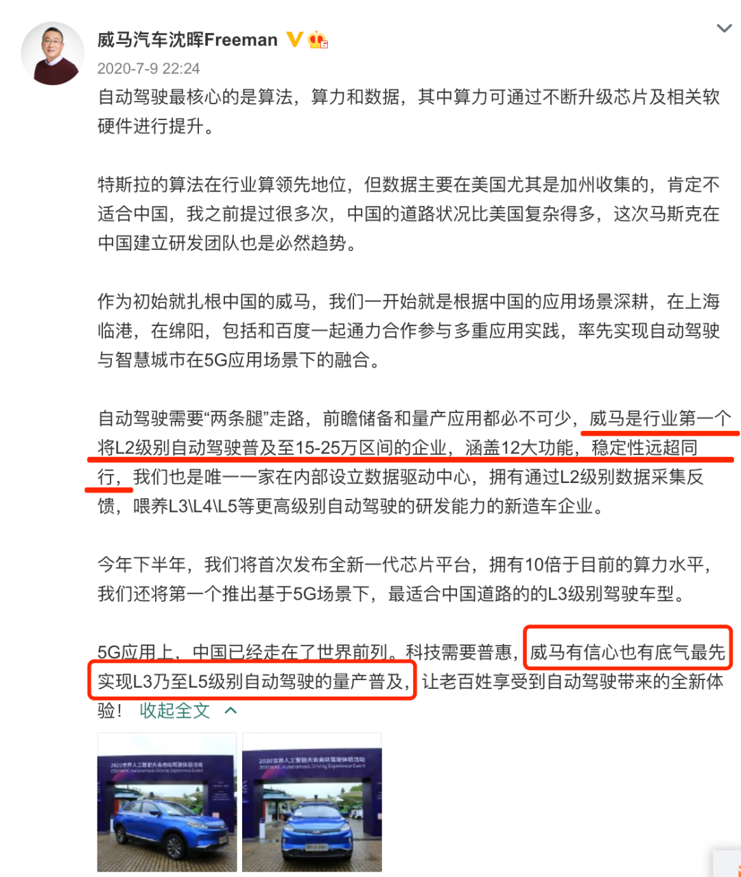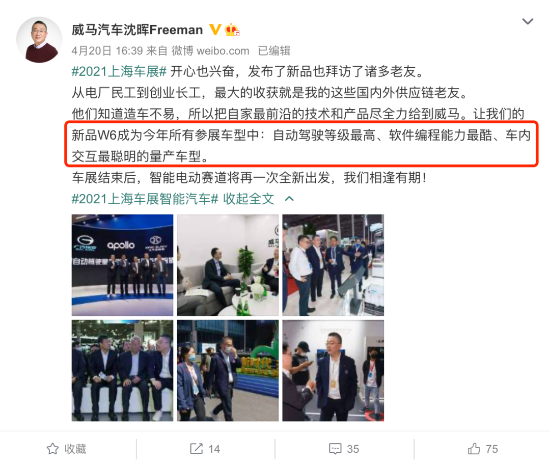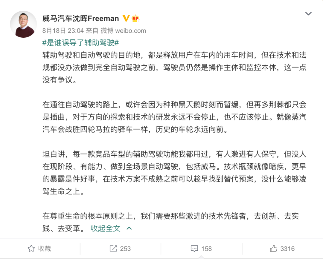 在8月18日,威马汽车的董事长兼CEO沈晖,就“蔚来自动驾驶致死”一事,在微博上发表了一番堪称自打脸的言论。