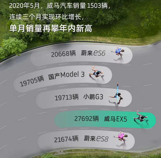 而在去年的五月份,威马又拿出来一份让人啼笑皆非的“销量榜”,里面列举了蔚来ES6、国产版特斯拉Model 3、小鹏G3、威马EX5以及蔚来ES8这几款车型的销量,其中威马以27692辆的销量“领先”于各位对手。然而,实际情况是威马EX5的这个销量数据为自2018年9月到2020年5月以来的总交付量,而特斯拉Model 3的数据则是2020年1月到4月的总销量,用自家21个月的销量去与人家4个月的销量来相比,多多少少是有些“不地道”了。