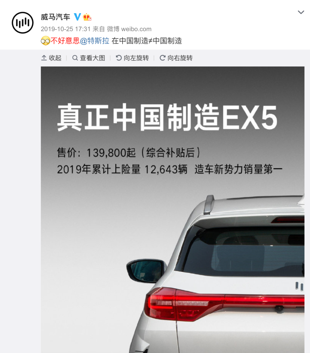 而在2019年10月,正值特斯拉国产版Model 3最火爆的时候,威马汽车通过官方微博公然向特斯拉“挑衅”,声称中国制造≠中国制造,换言之,虽然Model 3已经国产化,但是身为洋品牌的特斯拉依旧不能与威马比较,而威马旗下的EX5才是真正的中国制造。