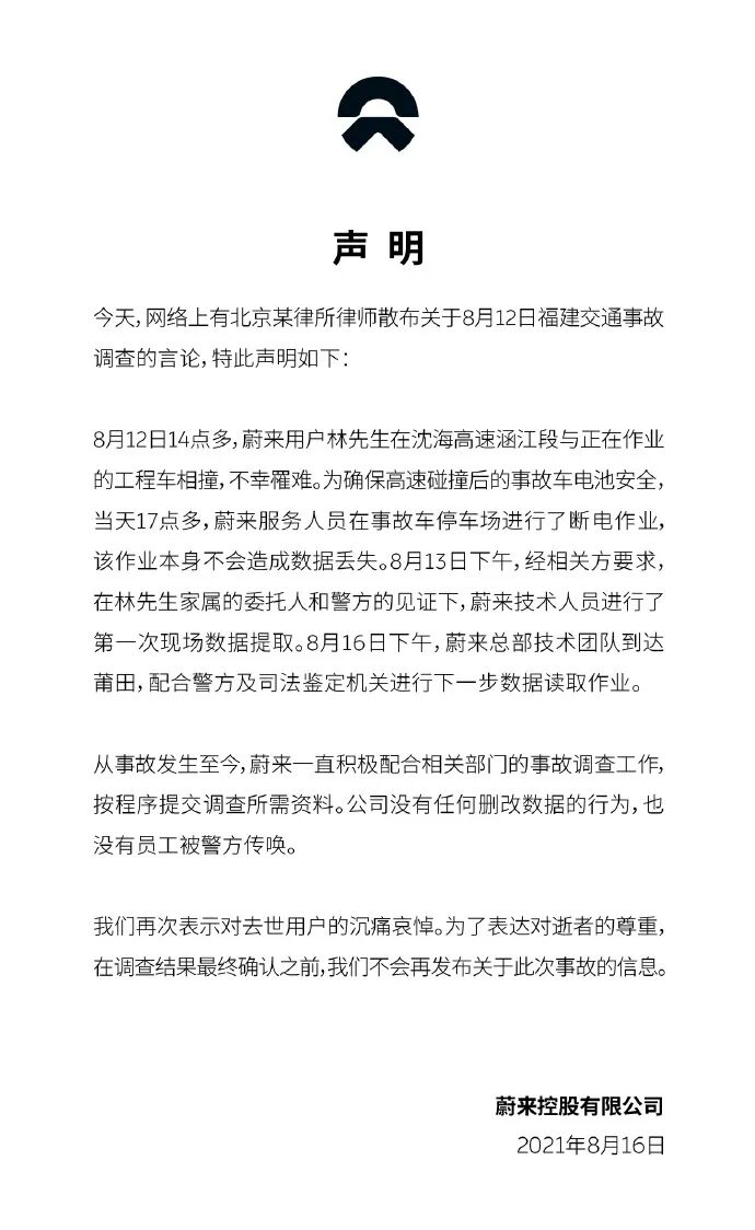 但是在8月16日,蔚来公司通过官方微博发表声明,称蔚来技术人员对现场的数据提取是在家属的委托人以及警方见证下进行,而此前的断电作业也不会造成数据丢失。
