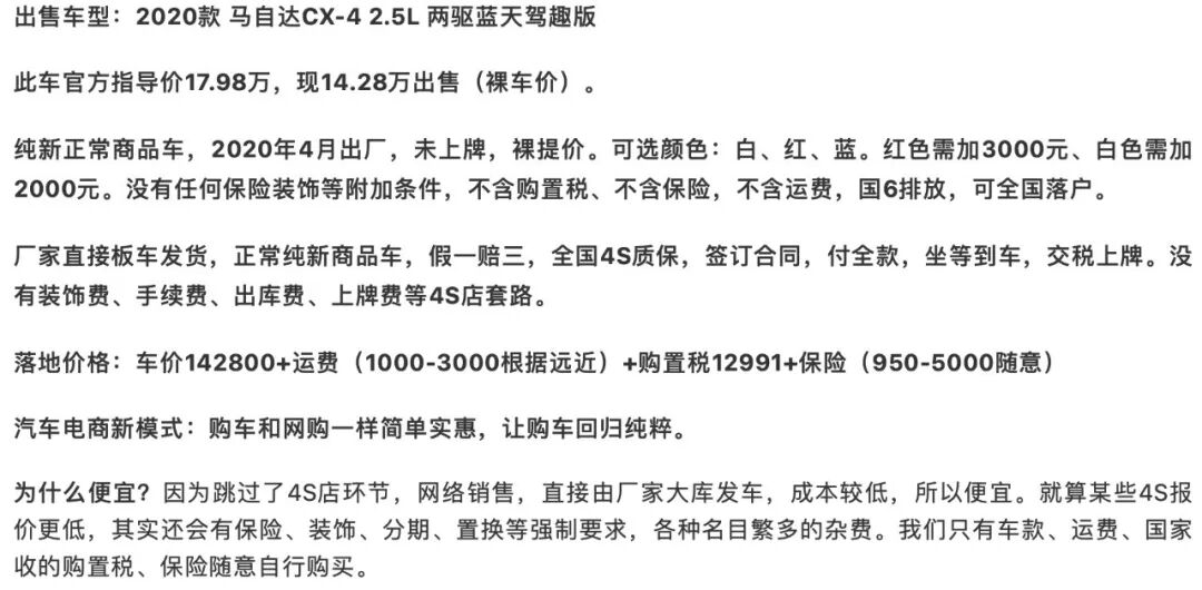 同时,市场上也出现了一大批的阿特兹以及CX-4的“骨折”车,均宣称为工厂直接发货,起售价统统跌破15万元,这个价格比起同期4S店的优惠底价还要低得多,这种全然不顾4S店死活,甩卖新车的做法,更是令人嗅到了一丝“绝望”的味道。
