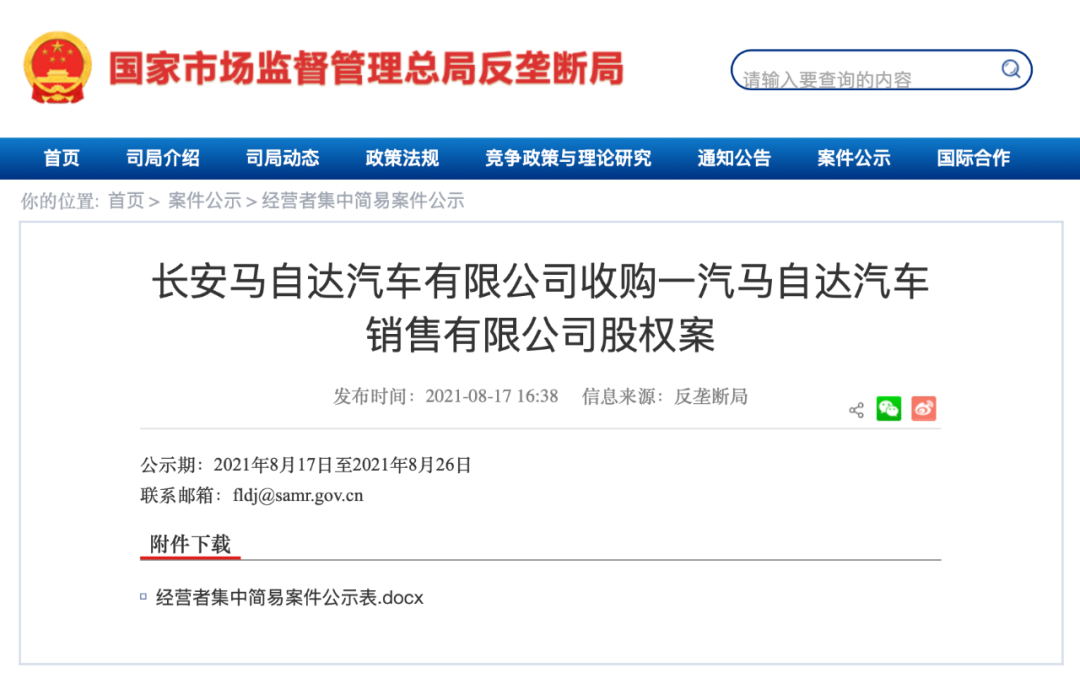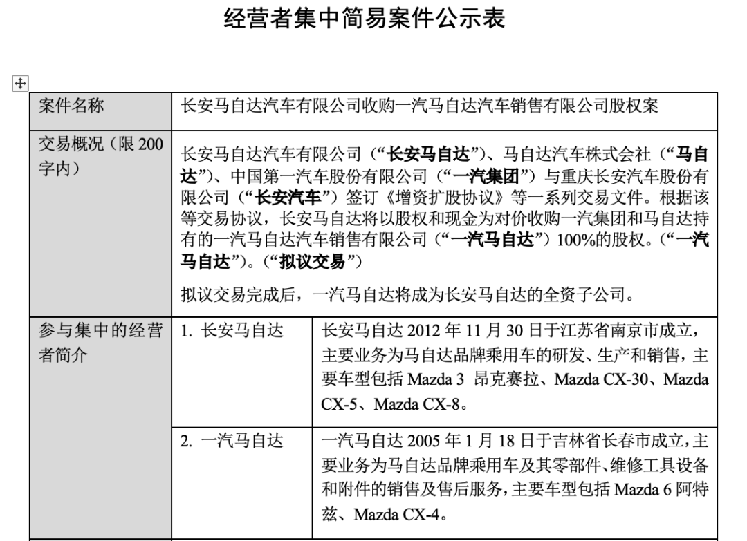 8月17日,长安马自达向国家市场监督管理总局反垄断局提交了一份名为《长安马自达汽车有限公司收购一汽马自达汽车销售有限公司股权案》的申请。