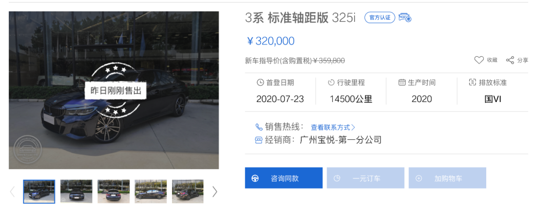不过,正所谓羊毛出在羊身上,买的不如卖的精,既然官方认证车源有那么多的好处,那这些车型的价格自然也就不会那么“美丽”了,就以平台上一款刚刚售出的3系325i为例,2020年7月上牌的它刚刚过了一岁“生日”,行驶里程为14500公里,其要价为32万,而同款、同等车况的3系,在其他平台上的要价普遍是在30万出头。