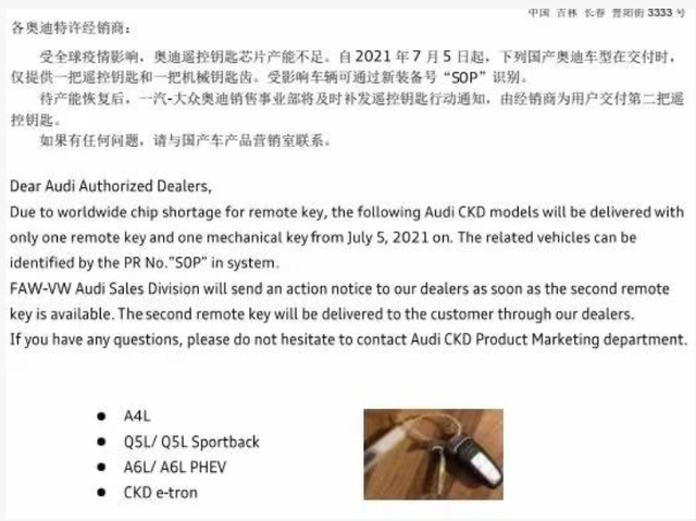 像是日本的丰田、本田,美国的通用集团等,都因为芯片不足而出现不同程度的停产,比如丰田就在日前停止了全球范围内14家工厂的生产任务,而奥迪在此前则是决定在交付的新车上,仅提供一把遥控钥匙,以便能省下尽可能多的芯片。在前段时间,他们更是传出厂家“建议”经销商们暂停接受新订单的新闻,以避免因车辆无法按时交付而与客户造成不必要的纠纷。
