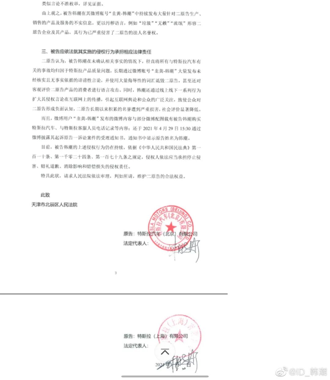 在昨日,也就是9月26日下午,车主韩先生在微博上公开了一份特斯拉的起诉状,特斯拉以“侵犯名誉权”为由,要求法院判令韩先生删除其在新浪微博平台上发布的侵权内容以及相关回复,而且要在微博刊登道歉声明并置顶30日。