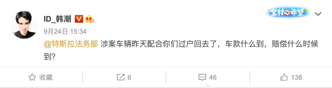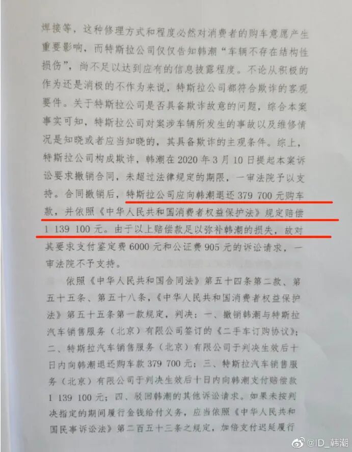 不过,从当事车主韩先生的微博中我们可以了解到,这笔赔偿款以及退还的购车款项在法院判决下来以后却迟迟没有被赔付给车主,而车主早已配合特斯拉方面将车辆重新过户至特斯拉公司名下了。