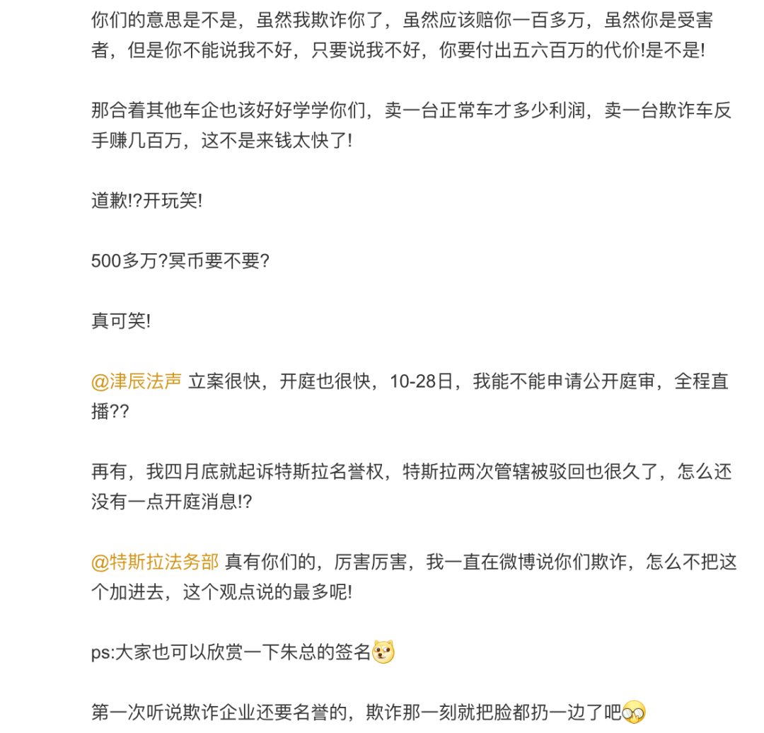 在起诉状的最后,我们能够看到特斯拉全球副总裁、大中华区总裁兼法定代表人朱晓彤的亲笔落款,换言之这次的起诉是真真正正的“最高指示”。按常理来说,一百多万的赔偿款对于特斯拉这种体量的车企来说不过是九牛一毛,按照法院判决赔偿了也就当息事宁人了,那为何他们要坚决死撑到底,不惜再次赌上其在公众之中的口碑呢?
