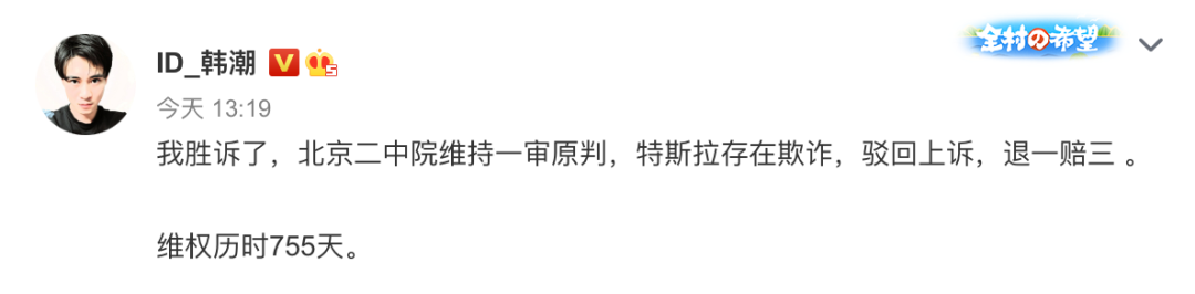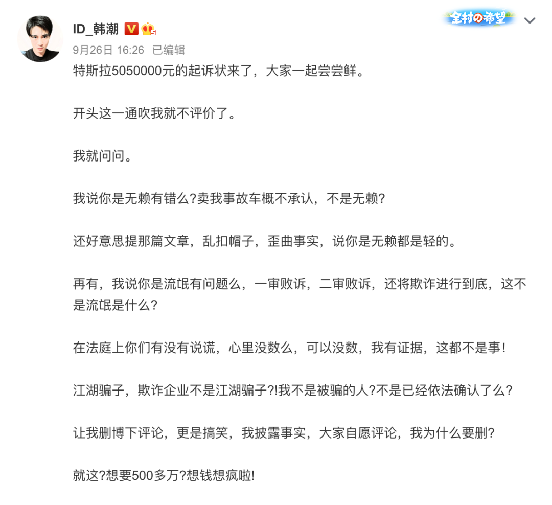 而韩先生的这些用词被他们认为会使公众对特斯拉形成负面认知,且名誉遭到严重损害。而针对特斯拉罗列的“罪状”,韩先生表示自己并无任何过错:首先,卖事故车不承认就是无赖;一审败诉,仍不服进行上诉,则是流氓;而江湖骗子,更是被法院判决“存在欺诈行为”所坐实,因此自己的言论与用词并无任何不恰当的地方。