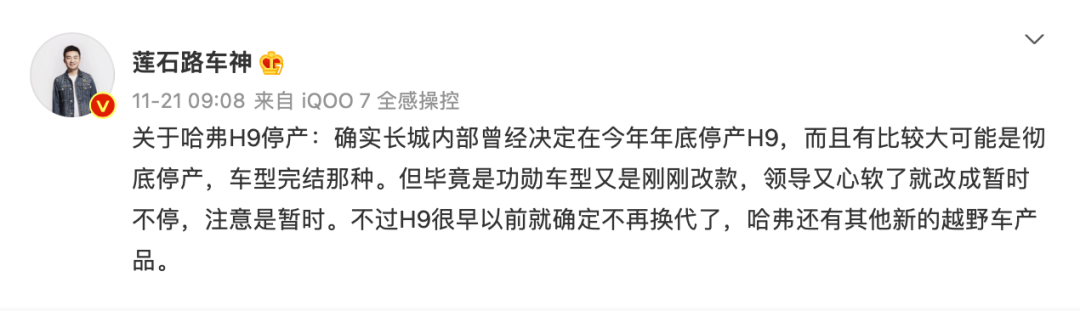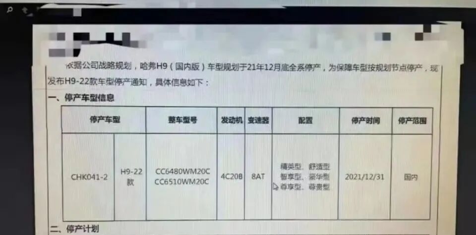 就在近日,网上流传出了一张长城内部关于哈弗H9的产品规划图,里面写了2022款H9国内版车型在售的六个版本将于2021年12月31日正式全系停产。