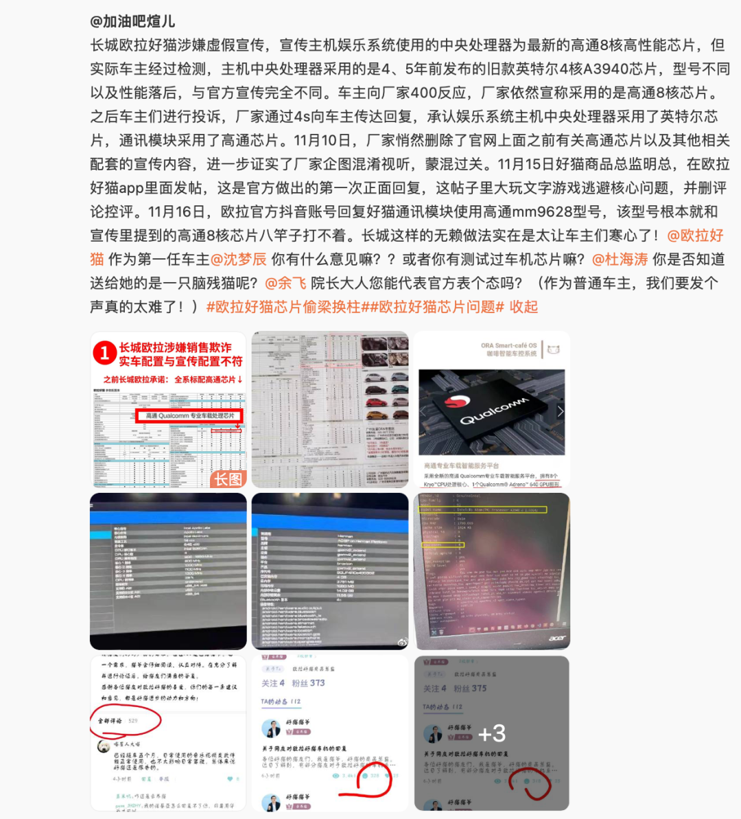 而在近日,长城的欧拉系列则是又被曝出存在芯片虚假宣传的情况。早前长城在宣传中表示欧拉好猫的车机系统采用的是最新的高通8核处理器,但是有车主在提车后发现,好猫上所搭载的车机芯片竟然是英特尔在4、5年前发布的4核处理器。