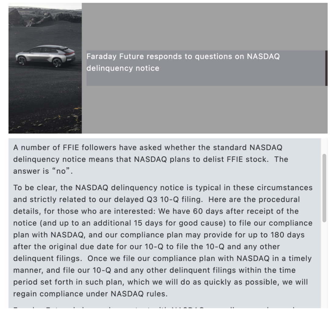 针对这个“退市风险”,法拉第未来也是紧急作出澄清,称纳斯达克的警示函仅仅是与法拉第未来延迟提交财报有关,与公司经营状况无关。目前法拉第未来正与纳斯达克方面保持着密切的联系,只要后续财报按时被提交,公司就不会存在被退市的风险。