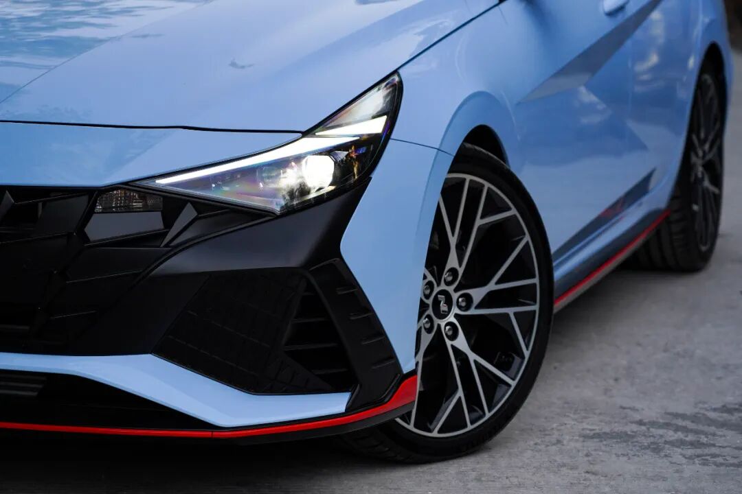 首先在外观上,作为一款正统的N系列车型,伊兰特N的外观比起普通版伊兰特要来得更加凶猛,特有的浅蓝色车漆加上黑化的前包围,让整台车散发出一种不怒自威的感觉。