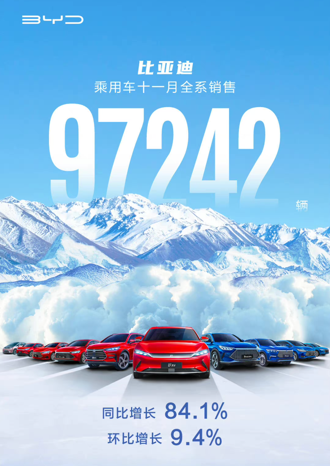 在刚刚过去的11月,比亚迪全系销量达到了97242辆,同比暴增84.1%。其中新能源车型在全品牌销量之中更是占据了统治地位,合计卖出了90121辆,同比增长达到252.7%。如此强劲增长势头,在已经逐渐从增量市场转变为存量市场的国内,显得尤其的突出。