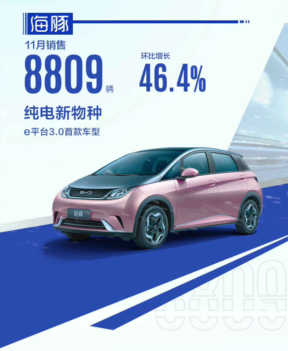 而除了宋PLUS系列以外,海豚也是店内的另一款重点车型,作为e平台3.0的首款产品,海豚系列在11月卖出了8809辆,也算是比亚迪给市场的一个小惊喜了。