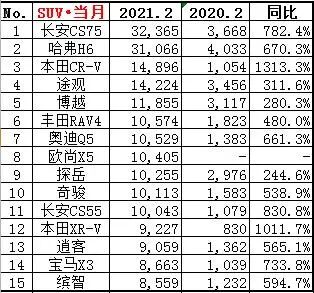 由于春节假期的缘故,二月份的实际销售天数恐怕只能勉强算半个月,因此我们也能看到二月份的新车销量与一月环比跌幅明显,不过车型之间的排名依旧能够反应出一款车在市场当中竞争力。