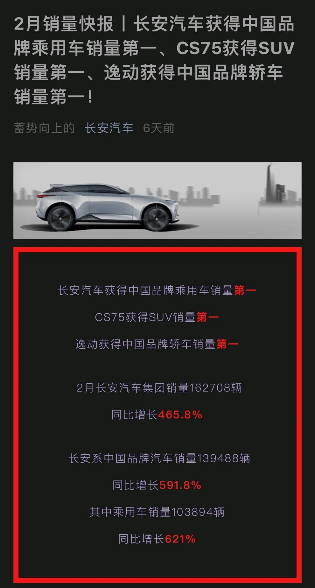 而长安方面也是毫不示弱,他们同样在自家公众号宣布自己夺得了品牌、轿车、SUV的“三冠王”。