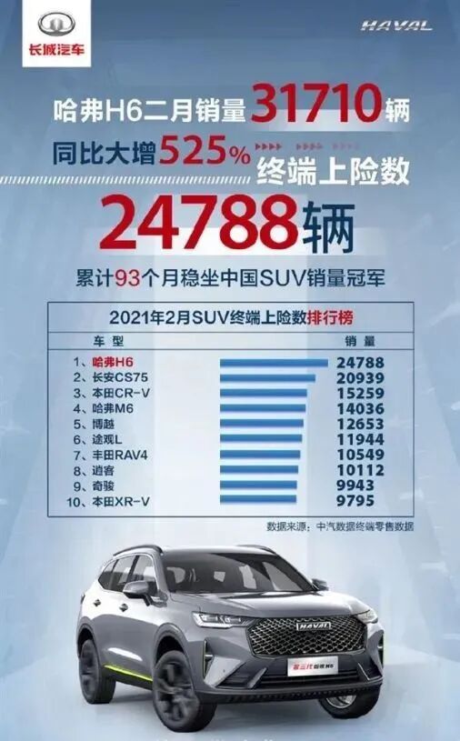 长城先是公布了一张“捷讯”海报,宣布自己连续93个月蝉联了SUV销冠,总销量为31710辆,虽然这个数字不如长安的高,但是他们在后面公布了H6的终端上险量为24788辆,而CS75仅为20939辆,因此这个月的冠军依旧属于H6。