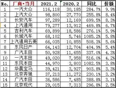 而近年来市场表现一贯强势的日系品牌,在二月份则是放缓了节奏,表现最好的东风日产、广汽丰田也不过只排在了8、9位。