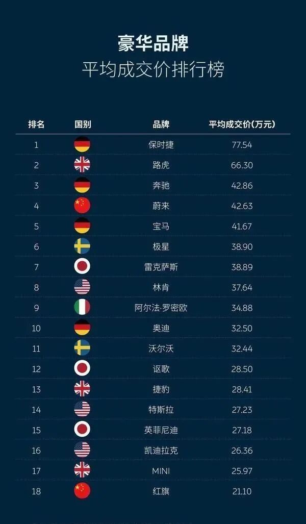 在这次统计的18个豪华品牌当中,包含了四个德国品牌、三个英国品牌、两个中国品牌、两个瑞典品牌、三个日本品牌、一个意大利品牌以及三个美国品牌。