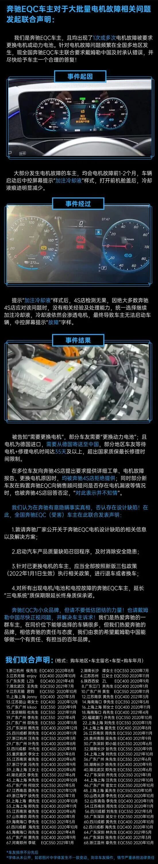 车主们的不满,终于在今年的春节前迎来爆发。68名来自全国各地的EQC车主,在1月底发布了一份联合声明,要求奔驰方面就EQC车型电机故障问题承认错误,并给予车主合理的答复。