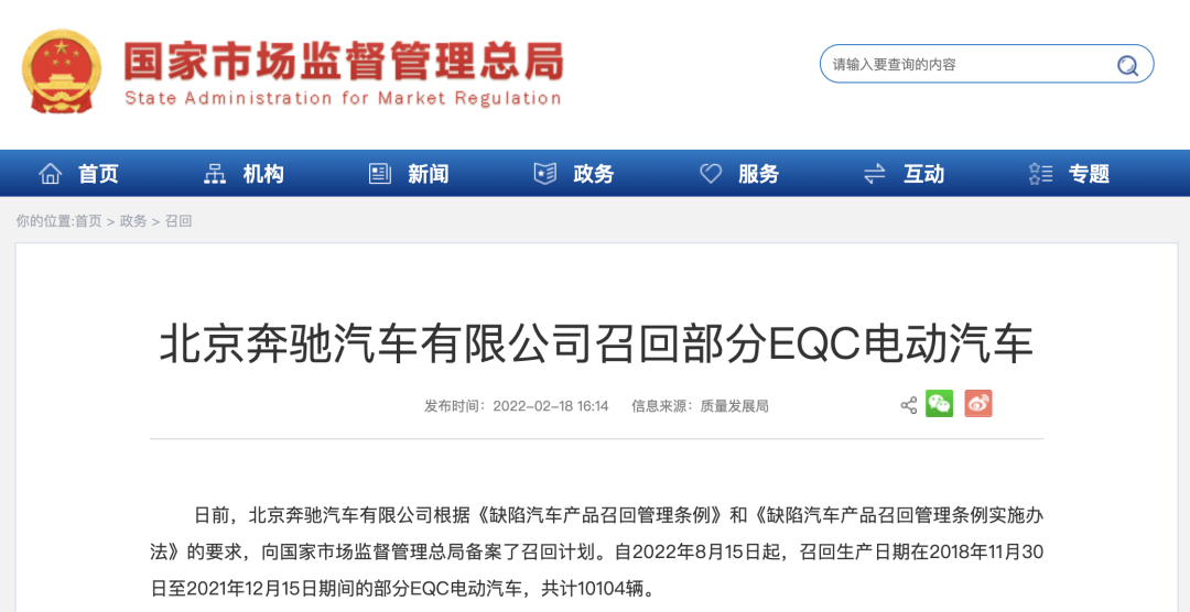 备案中提到,奔驰方面将于2022年8月15日起,召回生产日前在2018年11月30日至2021年12月15日期间生产的部分EQC电动汽车,共计10104辆。