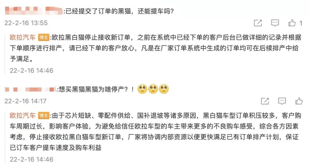 而欧拉方面在微博评论区曾给出解释,之所以停产这两台车,是因为黑猫、白猫车型的订单积压过多,而且芯片短缺,所以暂停接单,而已经下单的客户并不需要担心,因为厂家会依照下单顺序继续把剩余订单生产完毕。