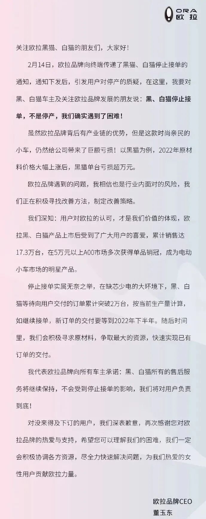 在昨日,欧拉方面通过官方渠道发布了一份声明,解释欧拉黑猫、白猫这两台热销车停止接单的原因。
