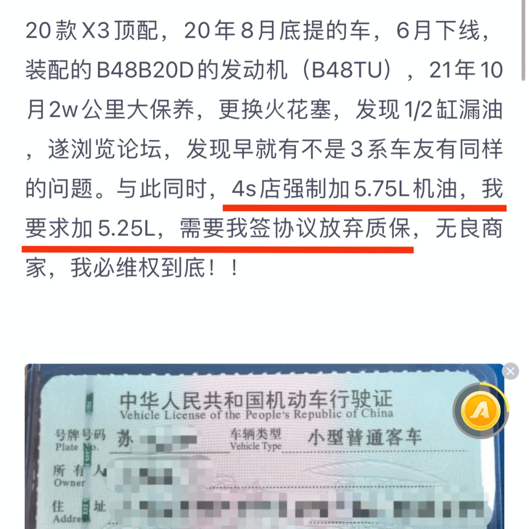 原本官方手册上标注B48 TU发动机机油加注量为5.25升,但是4S店在保养时则是会往发动机内添加5.75升机油,这多出来的机油不仅需要车主买单,而且据部分车主反映,由于油底壳中的机油过多,发动机还会出现异响以及动力衰减的情况。