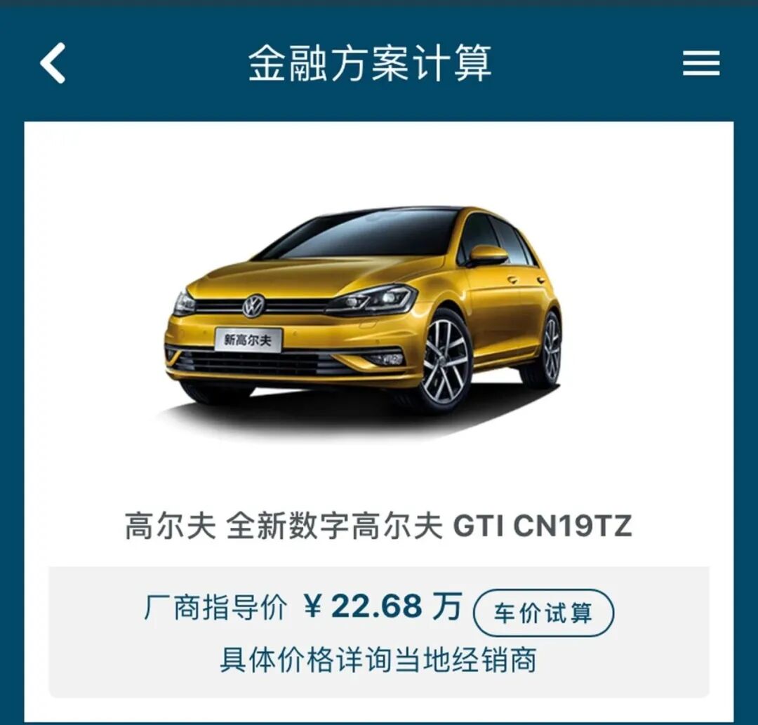 虽然目前新一代国产版GTI的具体售价仍未公布,但是有人已经在一汽-大众的金融购车方案上看到了“全新数字高尔夫GTI”的价格为22.68万元,虽然图片还是用的老款,但是名字是对的上的,而新款GTI的价格比起老款还便宜了7400元。