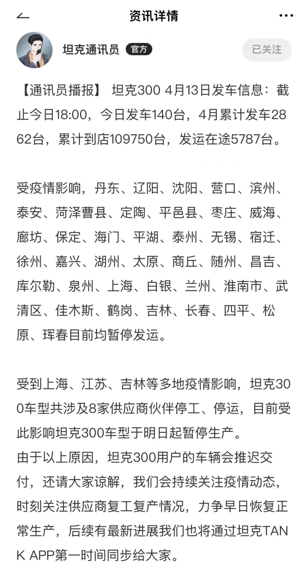 而这次停产,主要是受到上海、江苏、吉林等多地的疫情影响,导致多达8家坦克300车型的供应商陷入了停工、停运的状态。而作为目前坦克品牌的王牌车型,坦克300也只能被迫暂停生产。