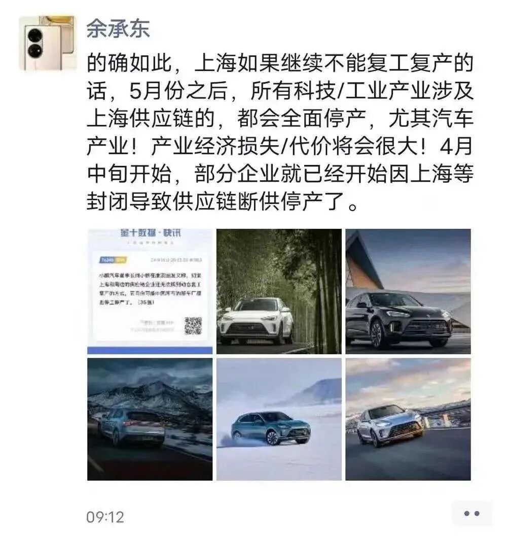 而华为汽车的负责人余承东也在朋友圈中“附议”,称上海供应链的停产将会为汽车产业带来巨大的经济损失。