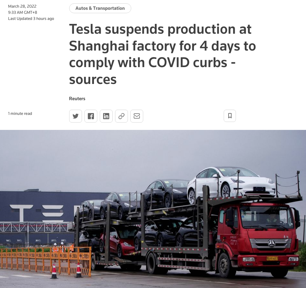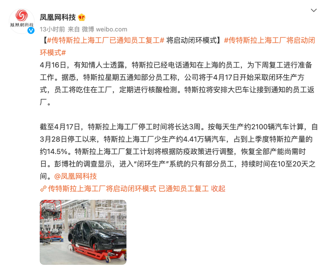 而同样位于上海的另外一家车企——特斯拉,在看到了上汽大众通过闭环管理保证生产以后,似乎也在蠢蠢欲动。在此前陷入了长达3周的停产以后,近日网上也开始传闻特斯拉正在通知旗下的工人,称将会在4月17日开始通过闭环生产的方式恢复工厂的运转。