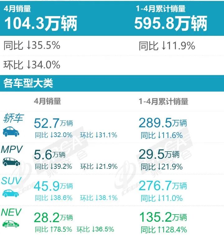 而日前,乘联会公布了4月份的中国市场新车零售数据,也恰好印证了这两位行业大佬的观点。根据乘联会的数据显示,4月份国内乘用车总销量为104.3万辆,出现了同比35.5%以及环比34.0%的暴跌,其中轿车销量为52.7万辆,SUV销量则为45.9万辆。