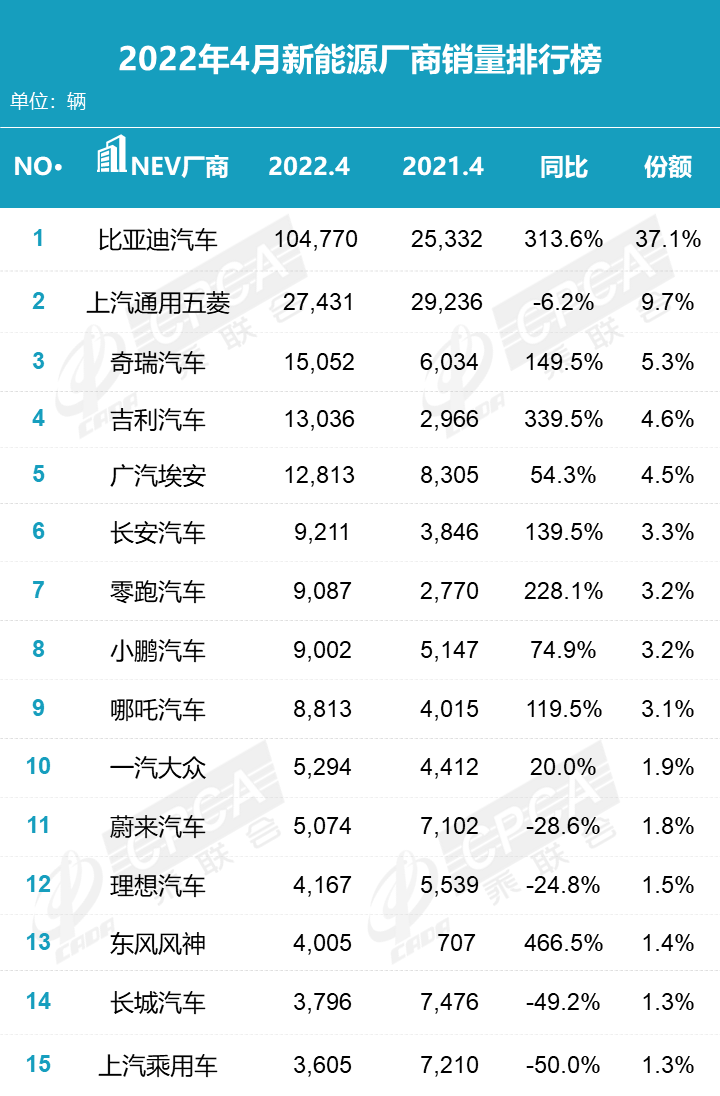 在比亚迪的强势带动之下,4月份的新能源车市场出现了逆势上涨的“奇观”。虽然环比依旧有着36.5%的下滑,但是与去年同期相比仍取得了78.5%的暴涨。其中已经早早宣布停产燃油车的比亚迪全部销量均归于新能源车,比亚迪品牌也占据了中国新能源车市场37.1%的超高份额。
