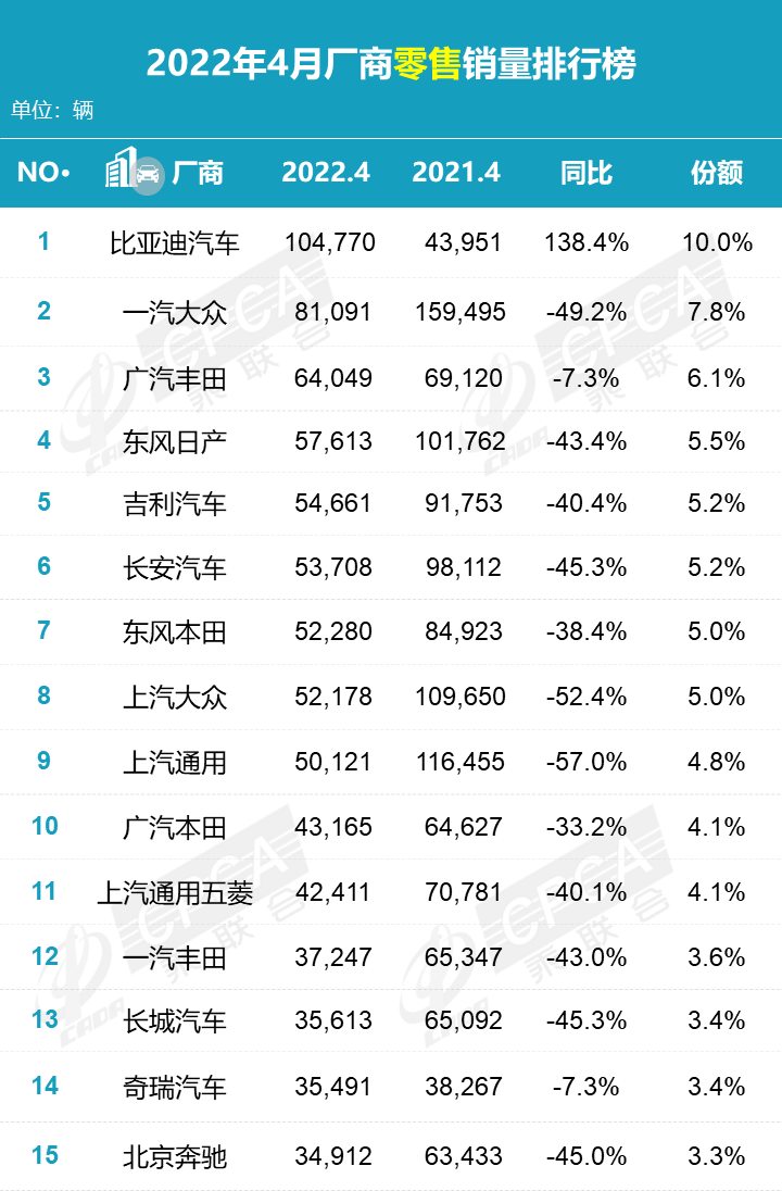 不过也有例外的,那就是比亚迪。作为国内少有的能够在主要零部件上实现“自给自足”的品牌,比亚迪这次受到的影响最小的,再加上其品牌近来的强势,4月份比亚迪销量达到了104770辆,成为了上个月唯一一家销量破十万的车企,与去年同期相比实现了138.4%的销量暴涨,同时市场份额也达到了10%,堪称是品牌的一个里程碑时刻。