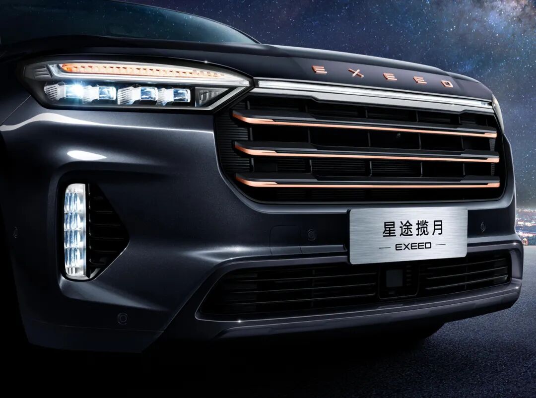 在前脸部分,揽月探享版采用的是一套名为“狮子座流星雨”的前脸格栅设计,整体以竖向的镀铬饰条为主,风格与星途品牌标志性的横向镀铬中网有着较大的差异,能让人一眼就分辨出来这是5座还是7座车型。
