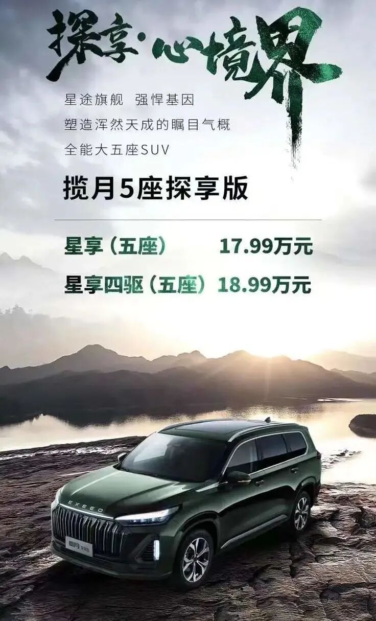 全新推出的星途揽月5座探享版售价区间为17.99-18.99万元,比起原来7座版19.39万元的起售价足足便宜了1.6万元,让揽月车系的整体售价得到了进一步的下降。