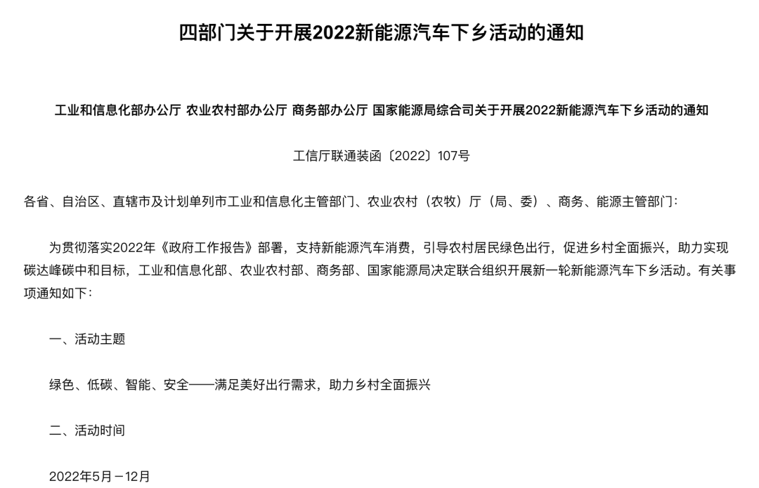 而说到“汽车下乡”,为了进一步刺激汽车消费,工信部也在昨日下发了关于开展2022新能源汽车下乡活动的通知,里面提到了工信部、农业农村部、商务部、国家能源局将会联合组织新一轮新能源汽车下乡活动,以便引导农村居民绿色出行。