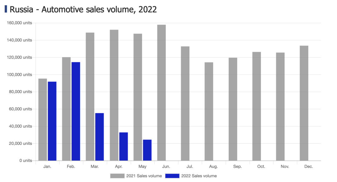 根据最新的同级数据显示,5月份俄罗斯本土市场新车销量同比下滑高达83.5%,比起四月份跌幅再度扩大,总销量仅剩下24268辆。