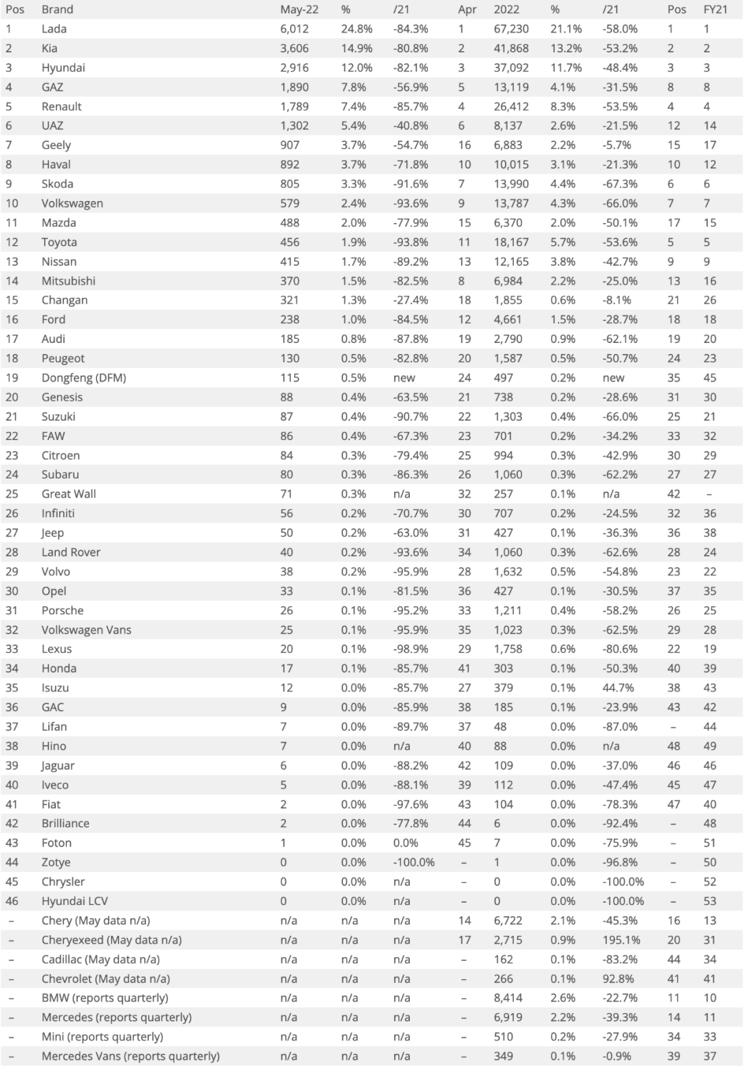 具体到品牌的话,尽管市场环境在剧变,但是前三甲的位置依旧非常稳定。俄罗斯老牌汽车厂商拉达依旧是销量最高品牌,但是在5月份拉达全品牌的销量也仅仅为6012辆。
