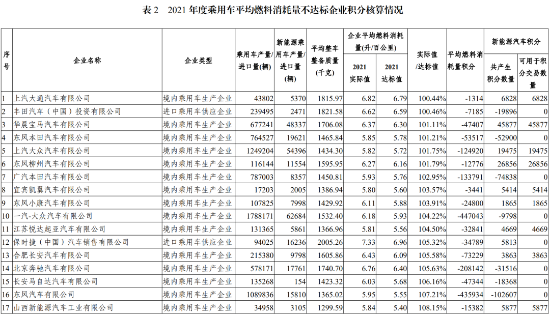 就在新政公布的前不久,有关部门公布了《2021年度中国乘用车企业平均燃料消耗量与新能源汽车积分情况》。里面多家车企的“不达标”情况可谓是让人触目惊心。