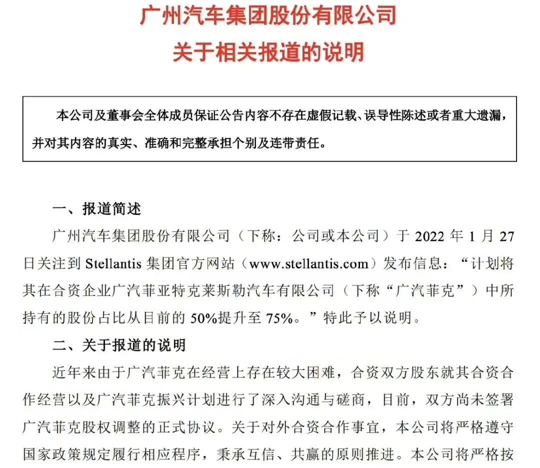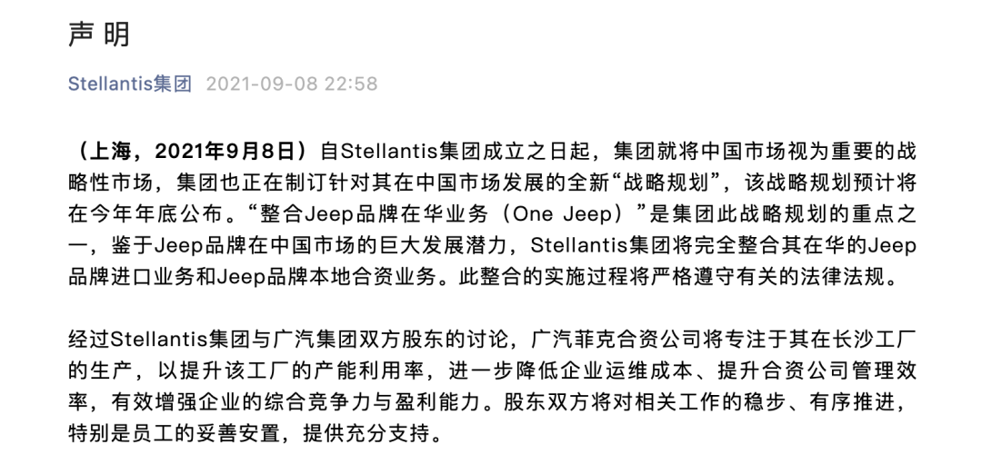 里面提到,由于此前Stellantis集团与广汽集团开展的谈判不成功,Stellantis集团无法获得在广汽菲克品牌中的主要话语权,所以双方决定终止合资。