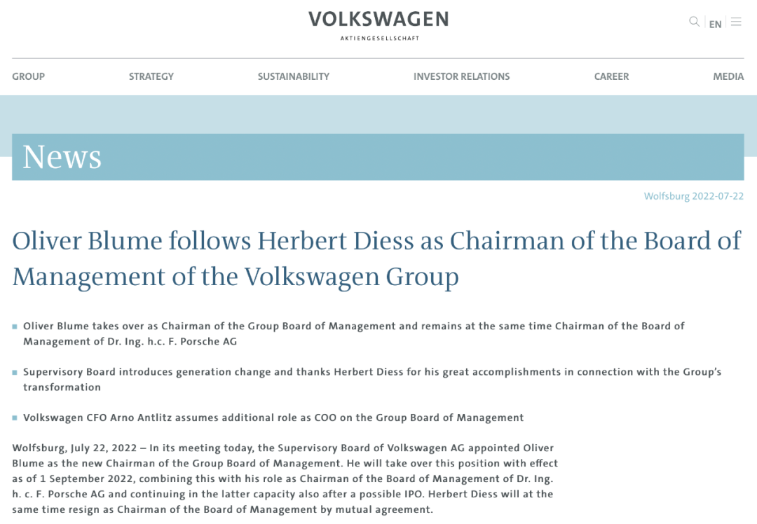 就在上周五,大众集团突然在官方渠道发布了一则声明,称集团经内部投票决定,目前的首席执行官赫伯特·迪斯将在今年9月1日提前卸任,而现任保时捷CEO将会接替迪斯出任大众集团CEO的职位。