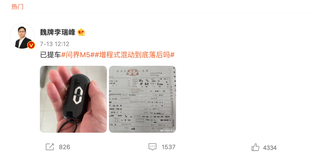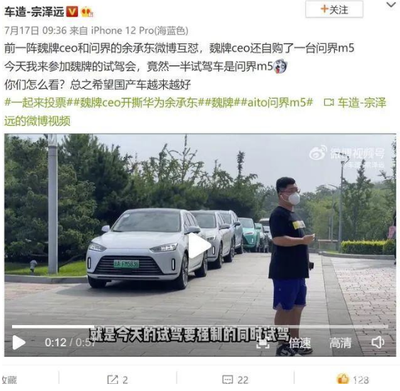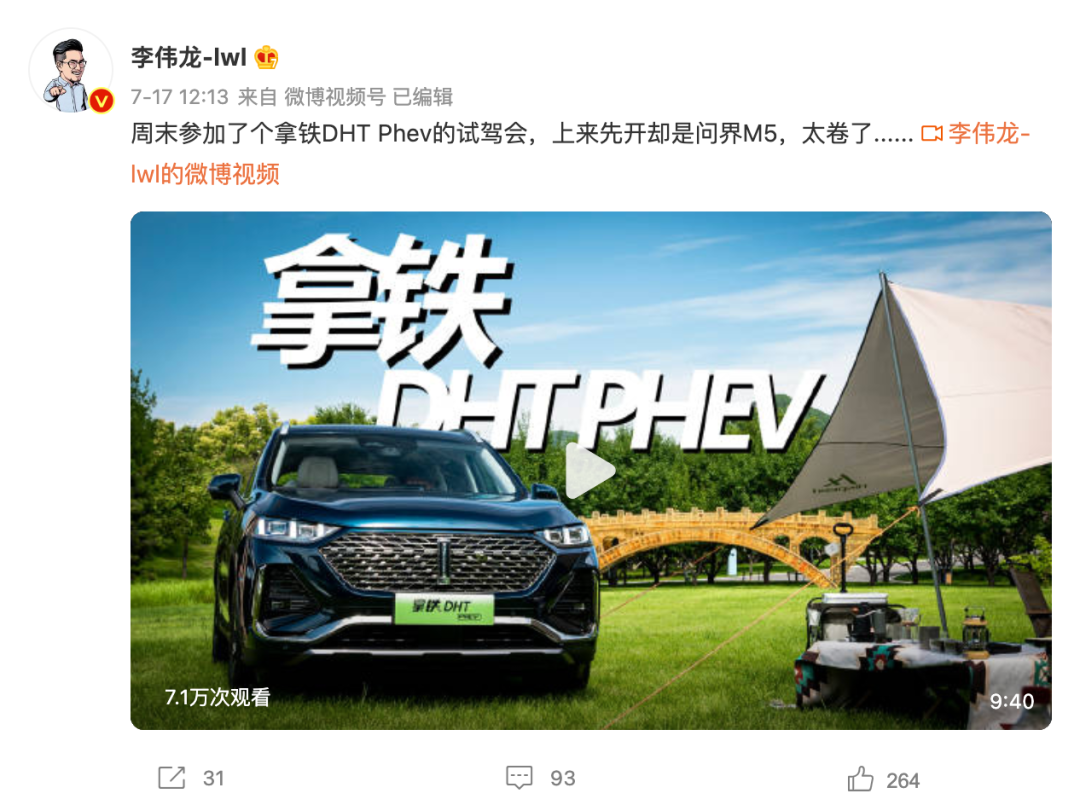 他不仅在一天之内,连续发布四、五条直指华为问界的微博,甚至还在微博上高调宣布自己花费了二十多万,亲自购入了一台华为问界M5,试图亲证增程式混动不如自家的DHT混动。