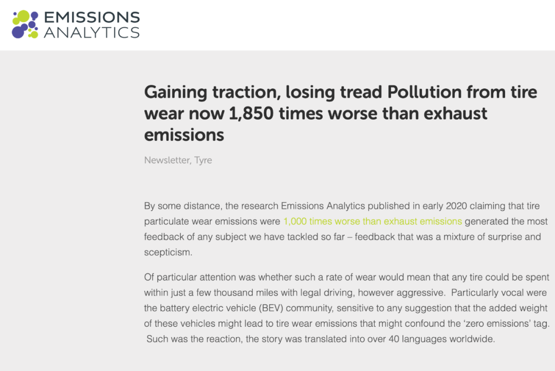在燃油车尾气处理已经愈发严格与完善的当下,来自于轮胎磨损的污染由于很难得到妥善处理,反倒是成为了各国环保机构面临的一大难题。