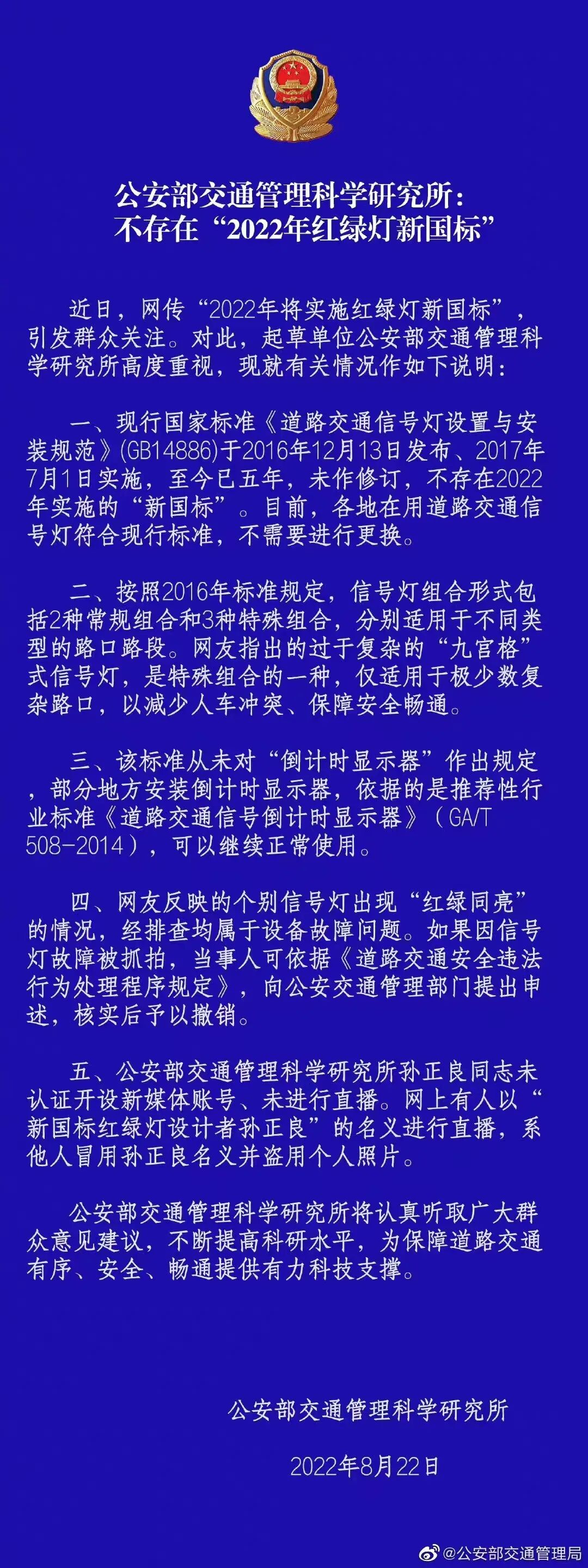 3、至于这次“国标红绿灯”登上热搜的诱因——“红绿灯设计者直播被骂事件”,则是有人冒用公安部交通管理科学研究所所长孙正良的名义,来进行网上直播。也就是说,虽然“民愤”是真的,但是直播却是假的。