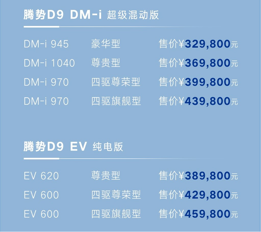 其中DM-i超级混动版车型售价区间为32.98-43.98万元,而EV纯电版售价则为38.98-45.98万元。